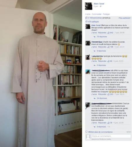 Le 6 juin 2015, Alain Soral se montre sur les réseaux sociaux en tenue traditionnelle islamique : "Offert par un frère de retour de la Mecque et très agréable à la maison par temps chaud !"
