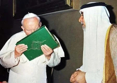 Le pape conciliaire Jean-Paul II embrassant le Coran le 14 mai 1999 devant une délégation de dignitaires sunnites irakiens, alors que son devoir est de dénoncer l'hérésie, et conduire les brebis égarées vers le chemin de Dieu, comme l'ont fait tous ses prédécesseurs pendant des siècles.
